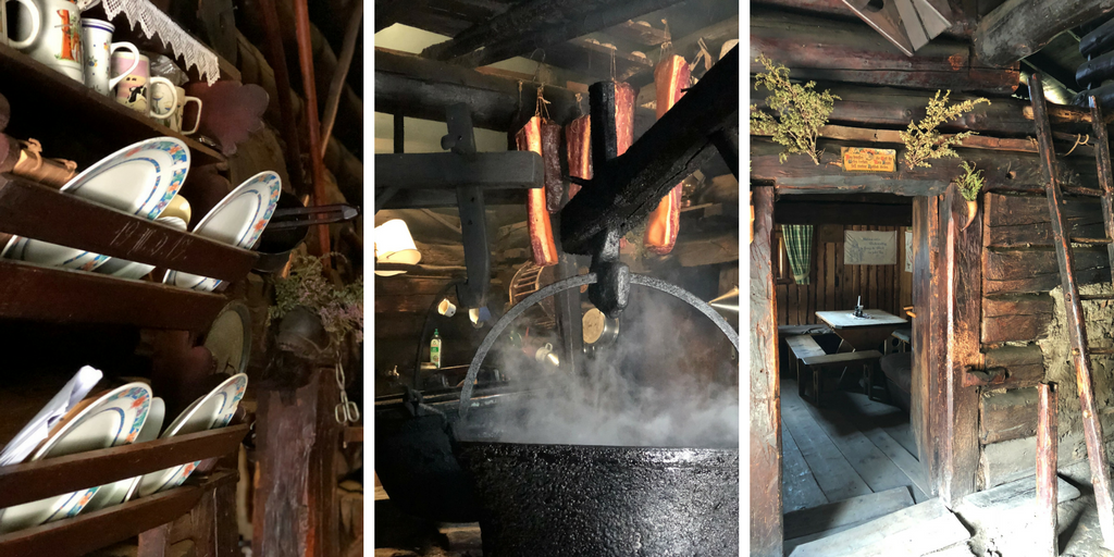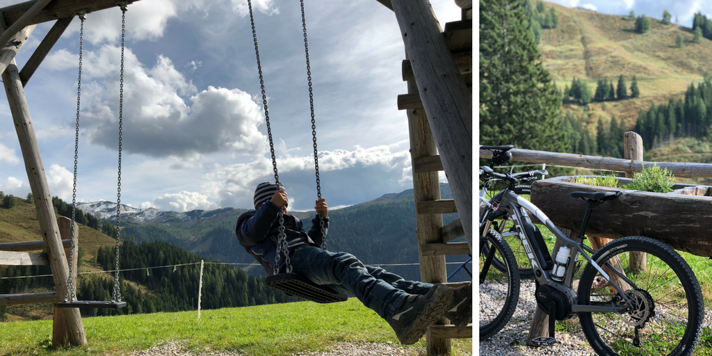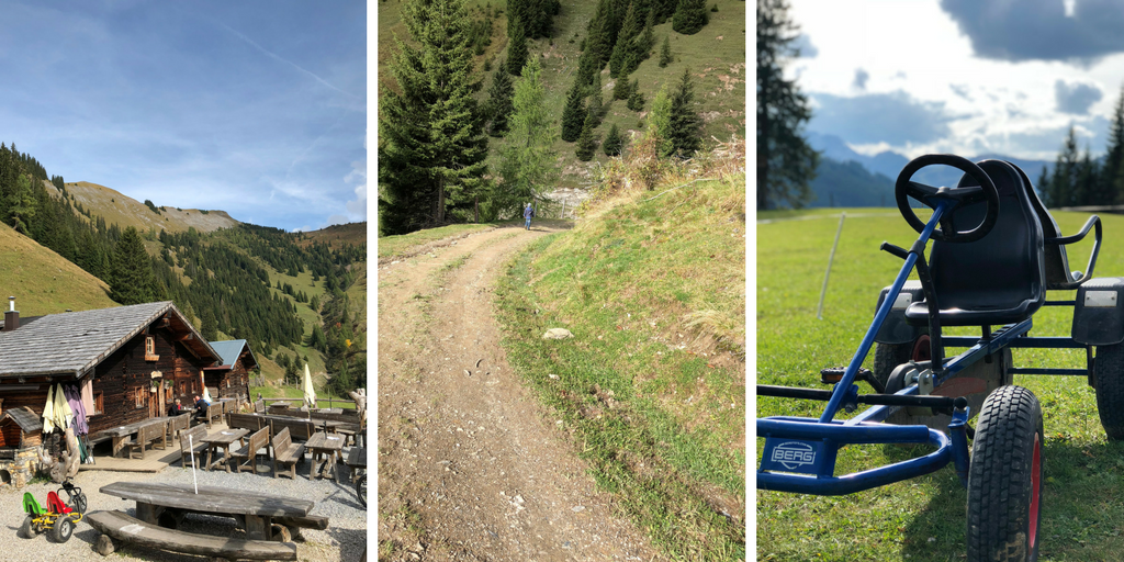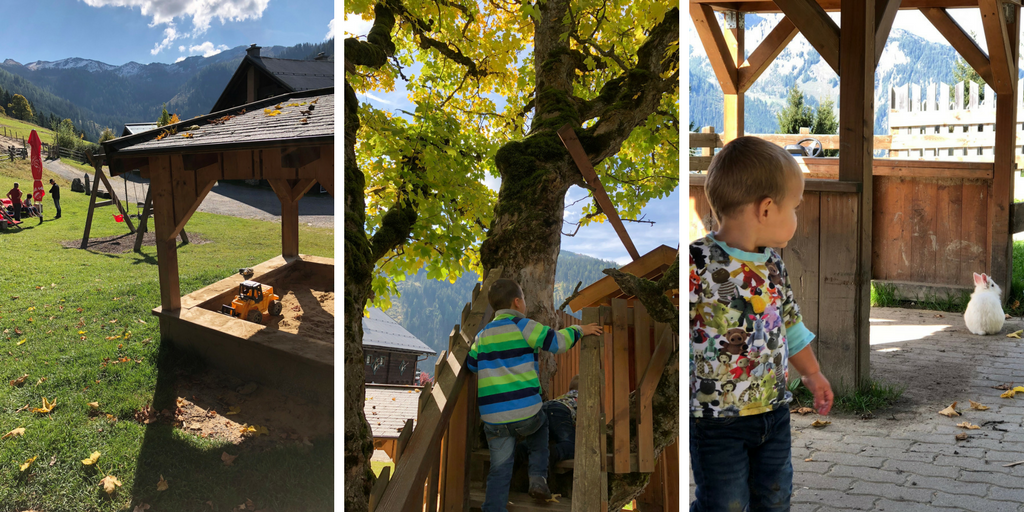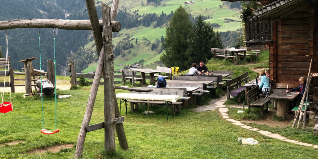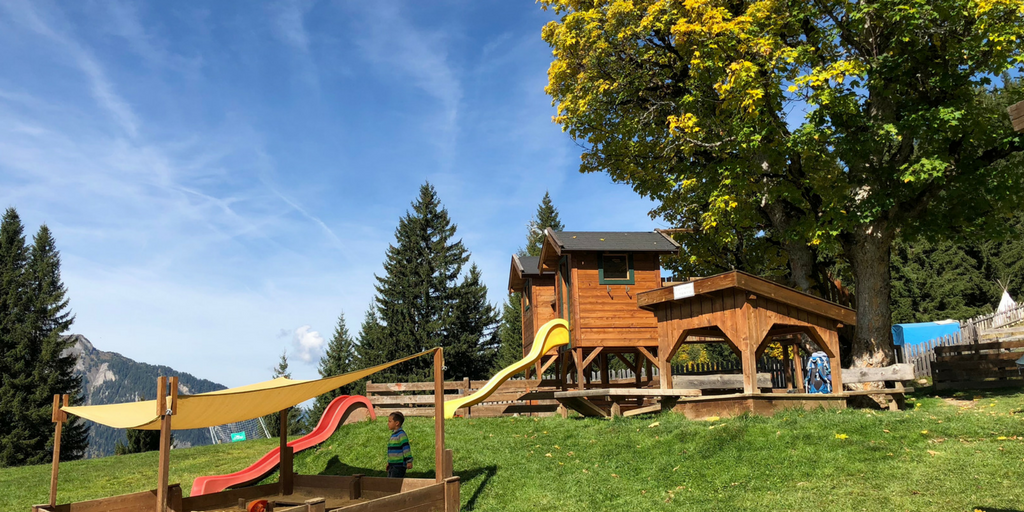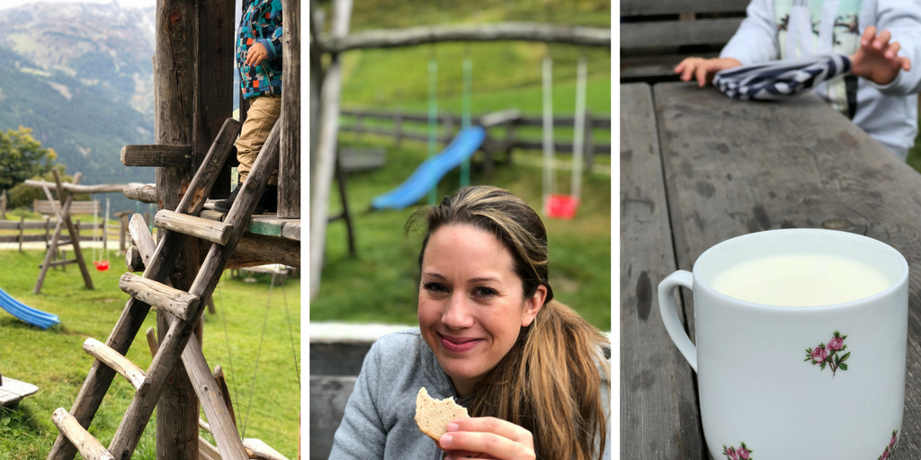 Hier wird noch ganz traditionell der Speck geräuchert. Gleich nebenan eine Stube in der die Brettljausn vorbereitet wird. Wir bestellten uns eine leckere Brotzeit, Schiwasser, frische Milch und genossen den wunderbaren Ausblick in der Sonne. Sogar ein kleiner Spielplatz grenzte an die Hütte. Die Kinder hüpften ein wenig auf dem Trampolin und spielten dann bestimmt 20 Minuten mit der Küche im Spielhäuschen.