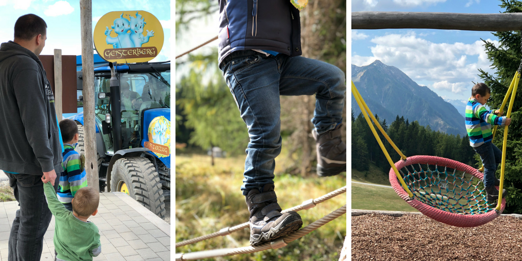 Die Jungs waren sofort von der riesigen Spielburg begeistert. Eine richtige Ritterburg zum Toben, Klettern und Rutschen. Im Herbst und unter der Woche, war hier kaum was los, was sehr angenehm war. Das Wetter spielte mit und wir genossen ein paar warme Sonnenstrahlen hoch oben über den Tälern. Die Kinder erkundeten die verschiedenen Spiele-Stationen, angefangen von der Burg, über verschiedene Rutsch- und Klettergeräte, einen schönen Wasserspielplatz bis hin zu den Erlebnisstationen im Geister-Motto. Sogar einen kleinen See konnten wir mit einem Floß durchqueren, ein tolles Erlebnis für die Kleinen und eine willkommene Abwechslung für uns Eltern.